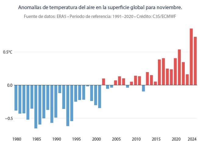 En noviembre de 2024, las temperaturas promediaron 14.10 °C a nivel global, convirtiéndose en el segundo noviembre más cálido registrado, solo después de 2023. Este mes también registró un incremento de 0.73 °C respecto al promedio de 1991-2020 y 1.62 °C por encima de los niveles preindustriales.