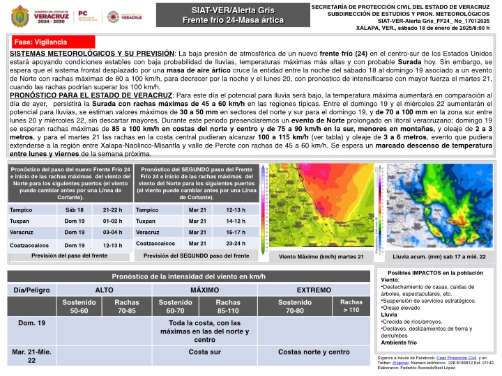 Evento de “Norte” de 20 a 30 km/h con rachas de 40 a 60 km/h durante la tarde-noche de este día y madrugada del domingo en Tamaulipas y Veracruz (norte).