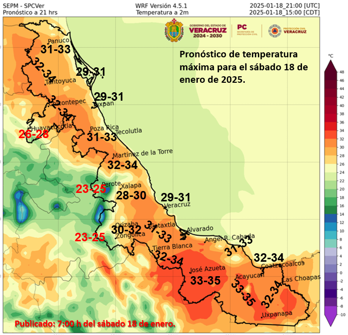 Las temperaturas máximas irán de 35 a 40 °C Jalisco, Colima, Michoacán, Veracruz, Guerrero, Oaxaca, Chiapas, Campeche y Yucatán.