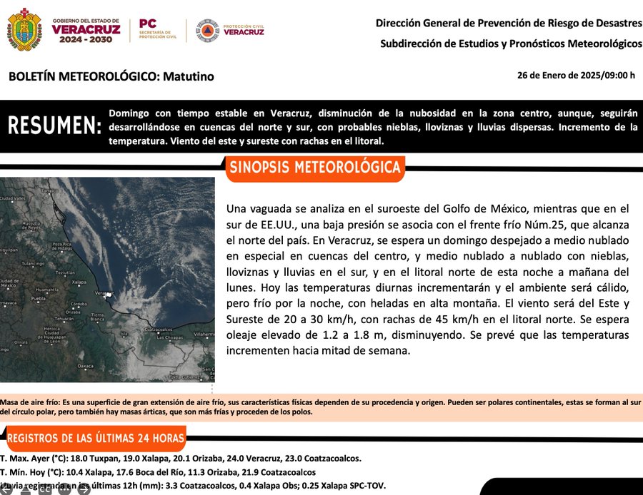Cielo medio nublado a nublado durante el día, bancos de niebla en zonas altas. Por la mañana, ambiente fresco en la región y frío en zonas altas de Veracruz. Durante la tarde, lluvias con chubascos en Veracruz, así como lluvias aisladas en Tamaulipas y Tabasco. Viento de componente sur de 20 a 30 km/h con rachas de 40 a 60 km/h en Tamaulipas; viento del este y sureste de 10 a 20 km/h con rachas de 30 a 50 km/h en Veracruz y Tabasco.