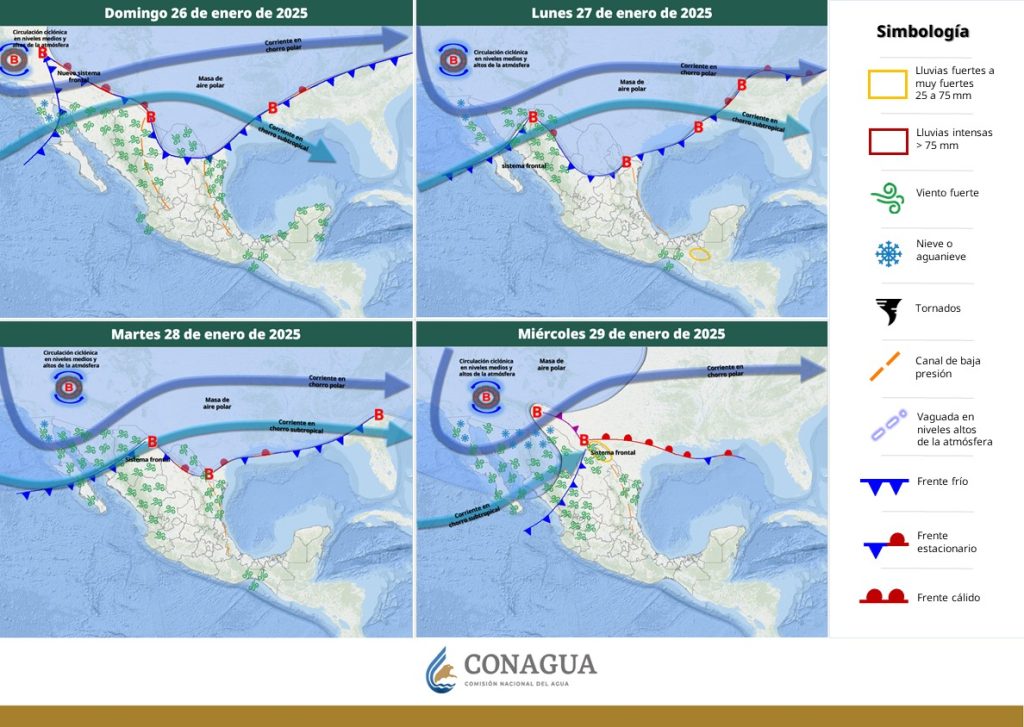 Durante este día, el frente frío No. 25 se extenderá sobre el noroeste y norte del país y se asociará con una circulación ciclónica en niveles medios y altos de la atmósfera.