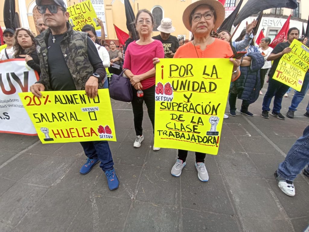 Afiliados del Sindicato Estatal de Trabajadores al Servicio de la Universidad Veracruzana (SETSUV), se manifestaron en la Plaza Sebastián Lerdo de Tejada de la ciudad de Xalapa para exigir a las autoridades universitarias paguen la homologación salarial a los trabajadores que sus percepciones están por debajo del salario mínimo.