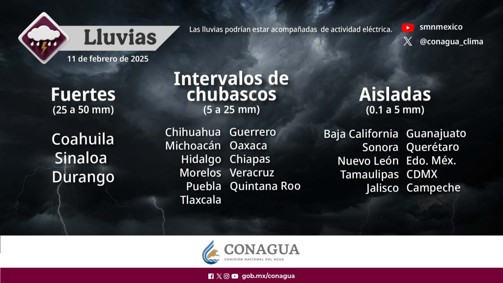 También, informa la CONAGUA, con una línea seca sobre Coahuila, originando lluvias y chubascos en zonas del noroeste, norte y noreste del territorio nacional,.
