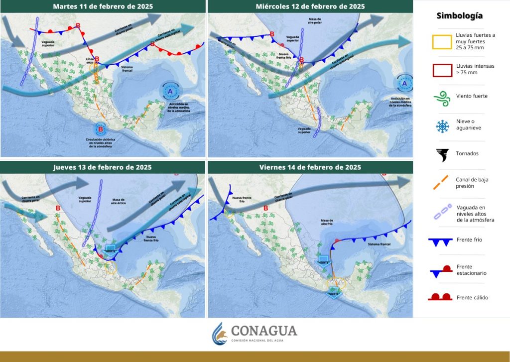 Además, lluvias puntuales fuertes en Coahuila, Sinaloa y Durango; vientos con rachas muy fuertes y marcado descenso de temperatura, al amanecer, en el noroeste y norte del país.