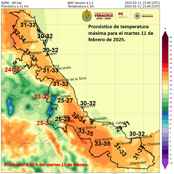 Las máximas 30 a 35 °C en Guanajuato, Aguascalientes, Hidalgo, Estado de México (suroeste), Veracruz, Tabasco y Quintana Roo.