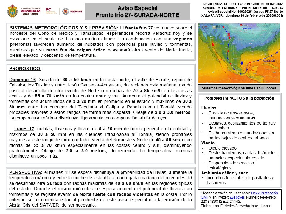 En las próximas 24 horas se espera aumento en el potencial de lluvias, los valores de la temperatura máxima disminuyen en comparación al día de ayer, persistirá ambiente fresco a frío por la noche-madrugada con posibles heladas en las partes más altas y el viento se fortalecerá dando lugar a evento de Norte con rachas de 70 a 85 km/h, oleaje incrementando. Se recomienda seguir las indicaciones de las autoridades locales de protección civil y consultar el Aviso Especial.