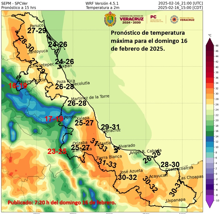 Pronóstico Climático: en el transcurso de la semana próxima en el estado de Veracruz se espera temperatura media y lluvia acumulada por arriba del promedio, especialmente en montañas. Mientras que el escenario para el mes de febrero indica un ambiente no tan frío y lluvia acumulada similar a la climatología.
