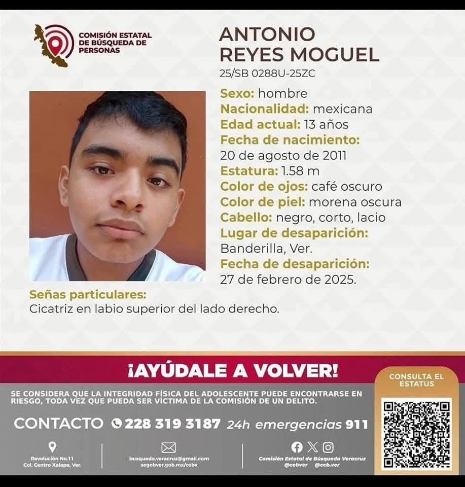 Antonio Reyes Miguel tiene 13 años, mide aproximadamente 1.58 m, ojos café obscuro, es de tez morena, cabello corto y lacio y; como seña particular tiene una cicatriz en el labio superior del lado derecho.