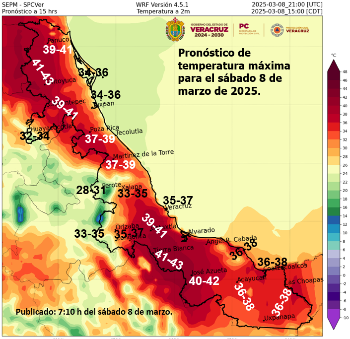Por la mañana, ambiente fresco y frío en zonas altas. Por la tarde, ambiente caluroso a muy caluroso. Cielo parcialmente nublado con probabilidad de lluvias aisladas en el sur de Veracruz. Sin lluvia en Tamaulipas y Tabasco. Viento de componente sur de 15 a 25 km/h con rachas de 40 a 60 km/h en Tabasco y Veracruz. Por la noche evento de “Norte” de 40 a 60 km/h con rachas de 70 a 90 km/h en Tamaulipas, extendiéndose durante la madrugada del domingo hacia Veracruz.