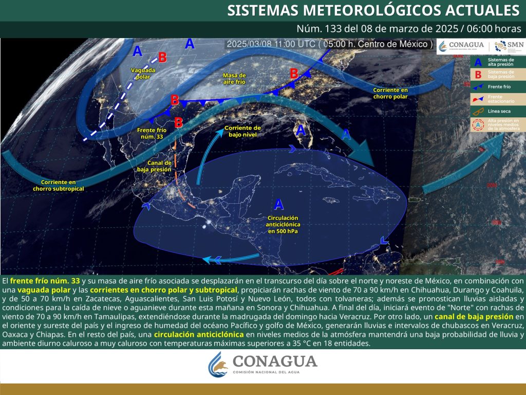 Hoy, el frente frío núm. 33 y su masa de aire frío asociada se desplazarán en el transcurso del día sobre el norte y noreste de México, en combinación con una vaguada polar y las corrientes en chorro polar y subtropical.