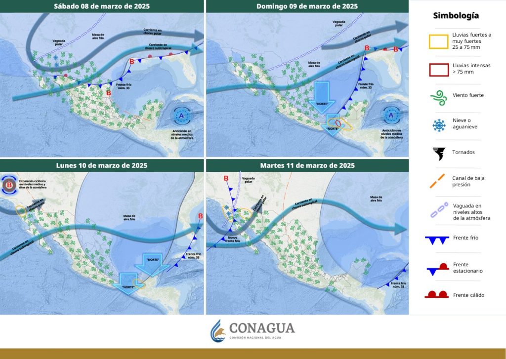Pronostica intervalos de chubascos (de 5 a 25 mm) en Chiapas; y lluvias aisladas (de 0.1 a 5 mm) en Baja California, Sonora, Chihuahua, Veracruz y Oaxaca.