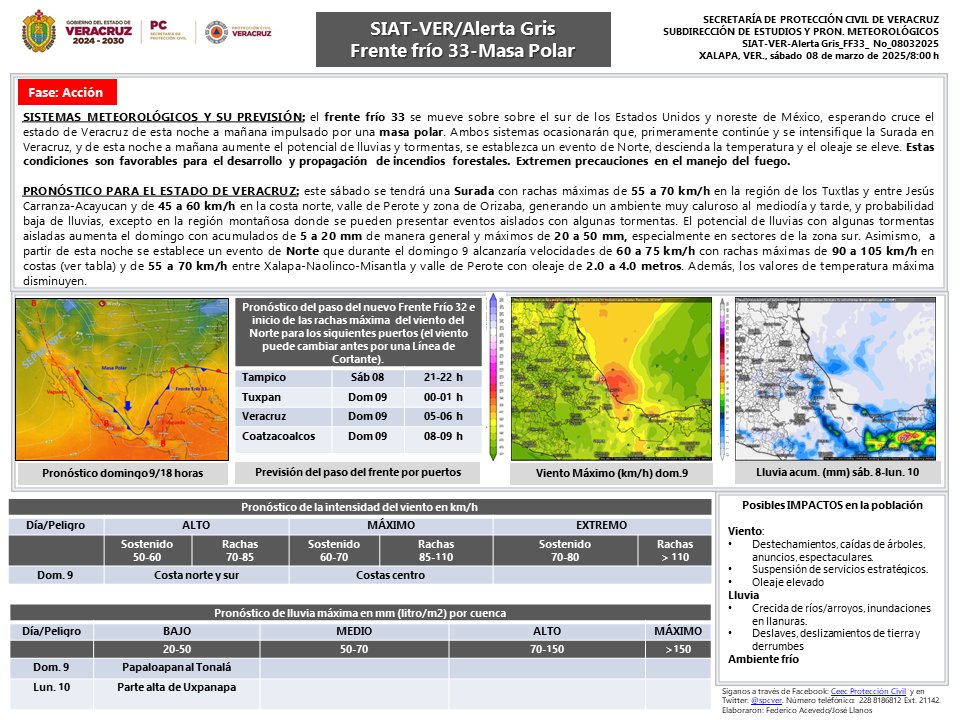 A final del día, apunta, iniciará evento de «Norte» con rachas de viento de 70 a 90 km/h en Tamaulipas, extendiéndose durante la madrugada del domingo hacia Veracruz.