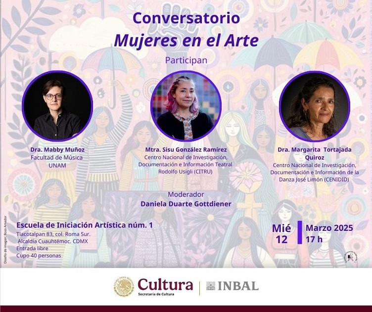 Con el propósito de visibilizar la labor que han tenido las mujeres en el arte, el Instituto Nacional de Bellas Artes y Literatura (INBAL), a través de la Subdirección General de Educación e Investigación Artísticas (SGEIA) y la Escuela de Iniciación Artística (EIA) Núm.1, ha organizado el conversatorio Mujeres en el arte, con la participación de destacadas especialistas quienes intercambiarán ideas y opiniones sobre el tema, en el marco del Día Internacional de la Mujer.