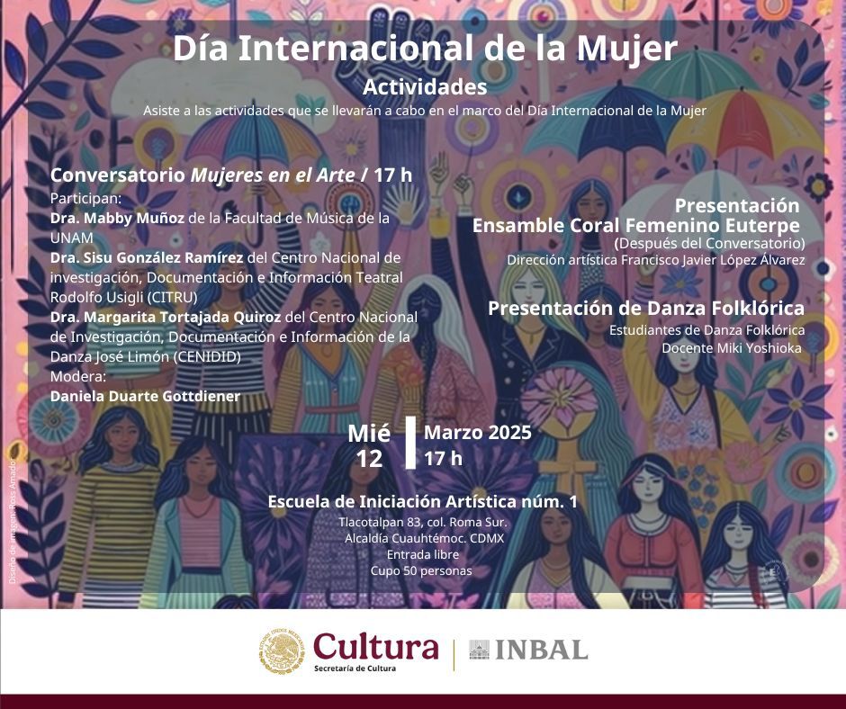 Cabe destacar que, posterior a la realización del conversatorio Mujeres en el arte, se presentará el Ensamble Coral Femenino Euterpe, bajo la dirección artística de Francisco Javier López Álvarez, y una presentación de danza folklórica a cargo de estudiantes de la maestra Miki Yoshioka.