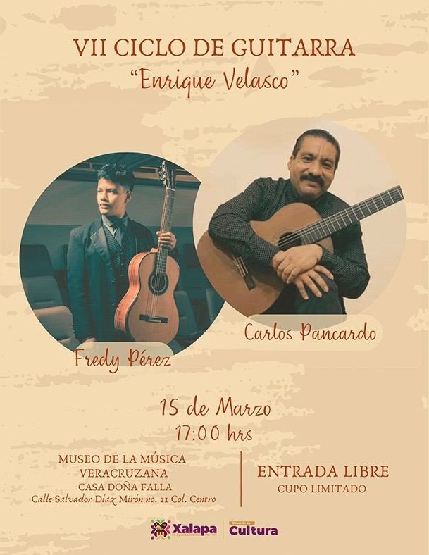 A las 17:00 horas, continúa el VII Ciclo de Guitarra “Enrique Velasco” con la participación de Fredy Pérez y Carlos Pancardo, en el Museo de la Música Veracruzana.