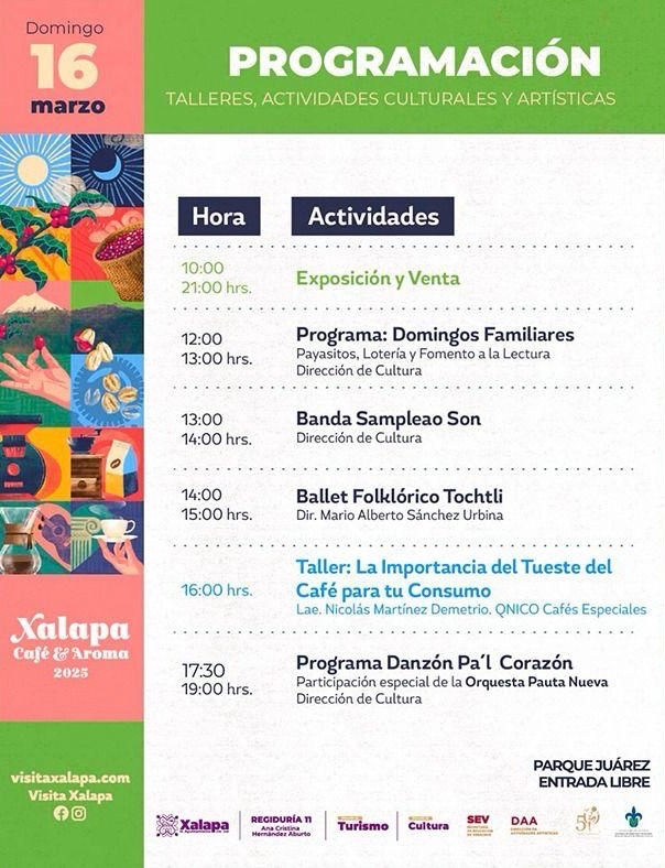 El domingo 16 de marzo, a las 10:00 horas, continúa “Xalapa, Café y Aroma 2025”, con una variada agenda que incluye el programa “Domingos Familiares”, y para terminar la tarde, “Danzón pa’l Corazón”, con la Orquesta Pauta Nueva, a las 17:30 horas.