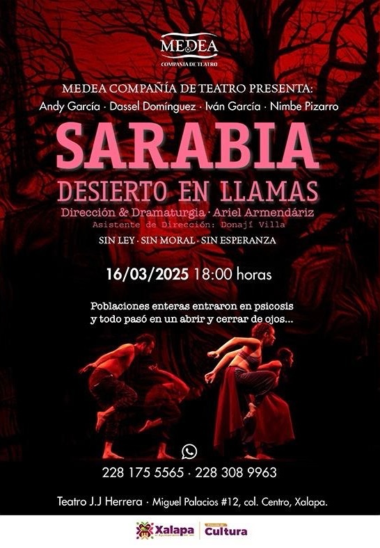 Finalmente, a las 18:00 horas, en el Teatro J. J. Herrera, se tendrá la obra “Sarabia, desierto en llamas”, de Medea Compañía de Teatro.