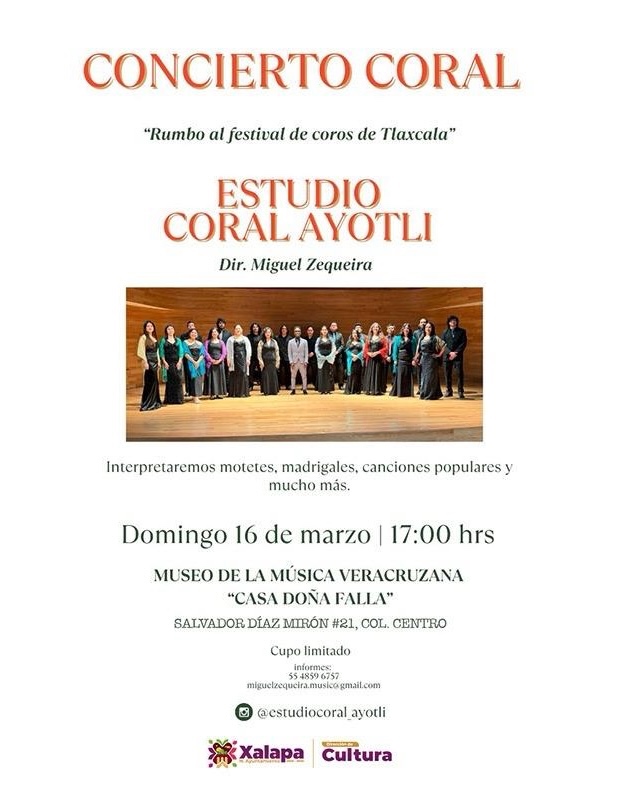 A las 15:30 horas, en la Iglesia de San José, se presentará la Orquesta Pauta Nueva, y a las 17: 00 horas, en el Museo de la Música Veracruzana, el Concierto Coral del Estudio Coral Ayotli.
