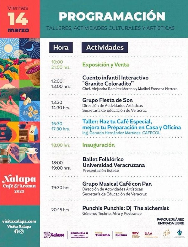 El sábado 15 de marzo, a las 10:00 horas, continúa “Xalapa, Café y Aroma 2025”, en el parque Benito Juárez, donde se podrán disfrutar del grupo Pilcuicani con música folklórica; la Compañía Internacional de Danza de la Universidad Euro Hispanoamericana, el Grupo Zenzontle y el grupo de rock Dijera.