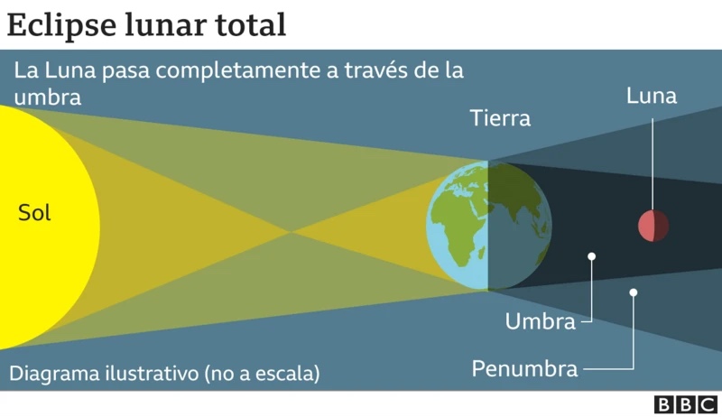 Y cuando es total, significa que toda la circunferencia lunar es afectada por la parte más oscura de la sombra terrestre (su umbra).