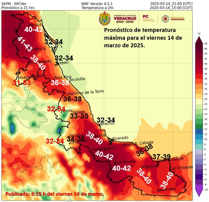 Probabilidad baja o prácticamente nula de lluvia. Sábado 15: persiste Surada con rachas de 65 a 80 km/h en el valle de Perote, zona de Orizaba, región de los Tuxtlas y entre Jesús Carranza-Acayucan.