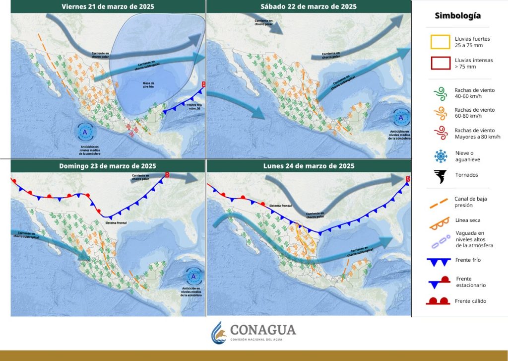 Viento de 20 a 40 km/h con rachas de 50 a 70 km/h y tolvaneras en Chihuahua, Durango, Zacatecas, Aguascalientes y San Luis Potosí.