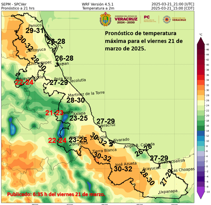 Cielo medio nublado a nublado en el transcurso del día, con intervalos de chubascos en Veracruz y Tabasco; sin lluvia en Tamaulipas. Por la mañana, bancos de niebla en zonas altas de Veracruz; ambiente fresco; muy frío con posibles heladas en zonas altas de Veracruz. Durante la tarde, ambiente cálido a caluroso en la región y muy caluroso en zonas de Tamaulipas. Viento de componente sur de 20 a 40 km/h y rachas de 50 a 70 km/h con posibles tolvaneras en Tamaulipas; con rachas de 40 a 50 km/h en Veracruz; y viento del noreste de 15 a 25 km/h con rachas de 40 a 50 km/h en Tabasco. Oleaje de 1 a 3 metros de altura en la costa Veracruz (centro y sur) y Tabasco.