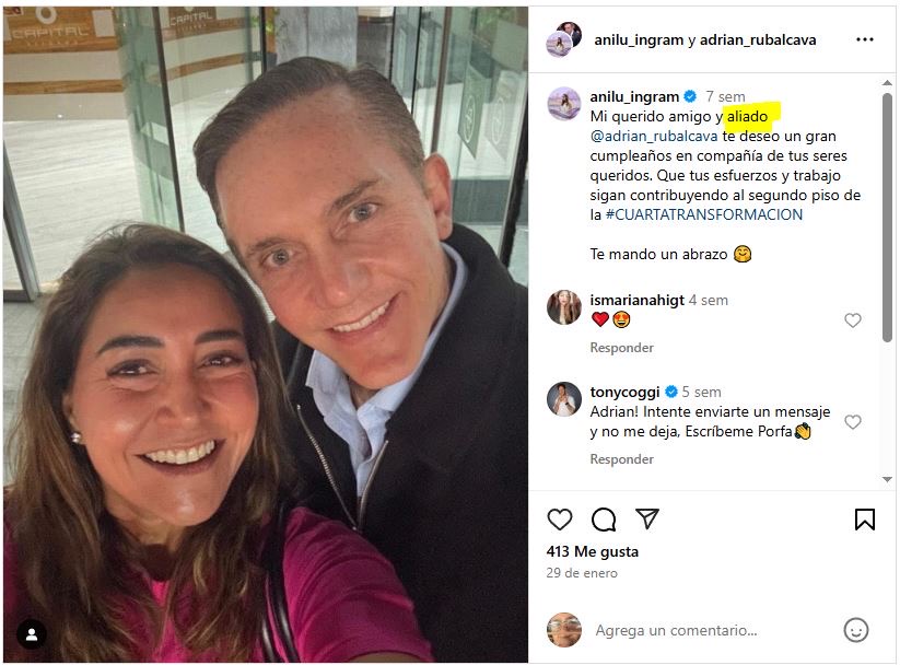 La cercanía de Anilú Ingram y Adrián Ruvalcaba se nota porque la primera etiqueta muy seguido en sus publicaciones de Facebook al segundo, después de etiquetar a la presidenta Claudia Sheinbaum y a la gobernadora Rocío Nahle.