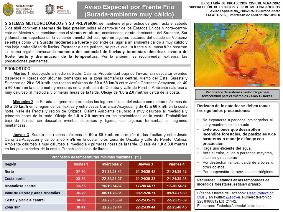 Viento de componente sur (surada) de 30 a 40 km/h con rachas de 60 a 80 km/h en Veracruz, Oaxaca y Chiapas; y de 10 a 20 km/h con rachas de 40 a 60 km/h en Tabasco, Campeche, Yucatán y Quintana Roo.