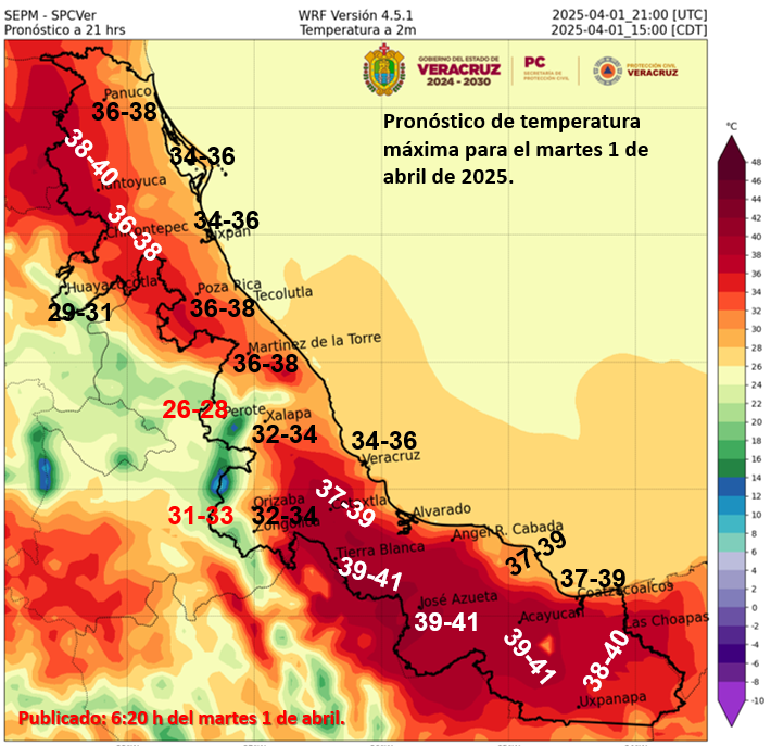 Las máximas 35 a 40 °C en Sonora, Chihuahua, Durango, Zacatecas, Guanajuato, Querétaro, Hidalgo, Estado de México, Veracruz, Tabasco, Yucatán y Quintana Roo.