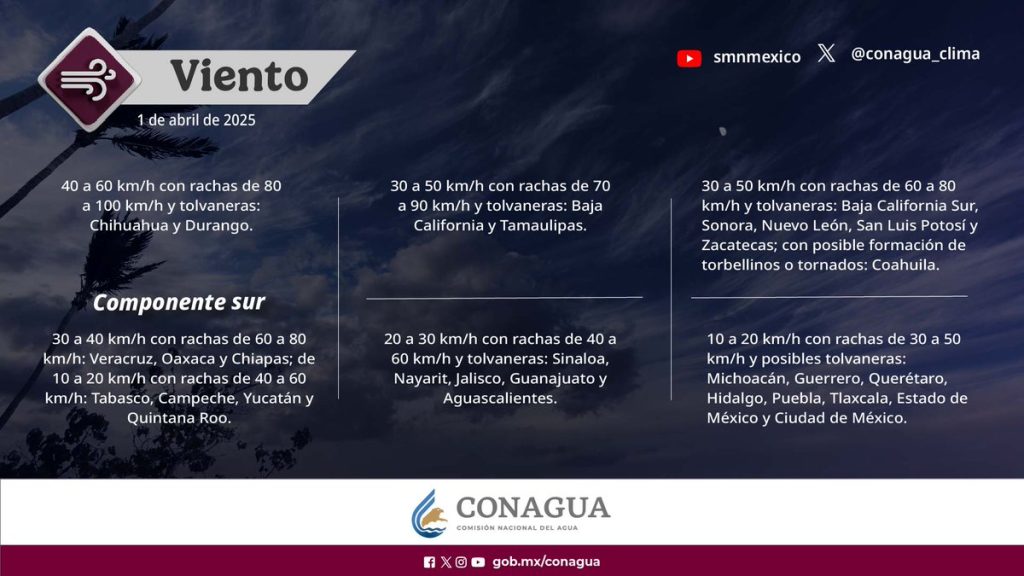 Viento de 10 a 20 km/h con rachas de 30 a 50 km/h y posibles tolvaneras en Michoacán, Guerrero, Querétaro, Hidalgo, Puebla, Tlaxcala, Estado de México y Ciudad de México.
