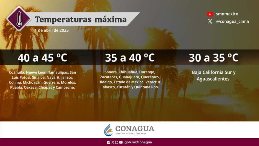 Las temperaturas máximas irán de 40 a 45 °C en Coahuila, Nuevo León, Tamaulipas, San Luis Potosí, Sinaloa, Nayarit, Jalisco, Colima, Michoacán, Guerrero, Morelos, Puebla, Oaxaca, Chiapas y Campeche.