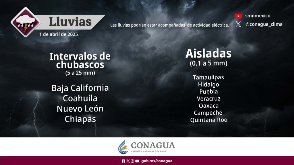 Pronostica intervalos de chubascos (de 5 a 25 mm) en Baja California, Coahuila, Nuevo León y Chiapas; y lluvias aisladas (de 0.1 a 5 mm) en Tamaulipas, Hidalgo, Puebla, Veracruz, Oaxaca, Campeche y Quintana Roo.