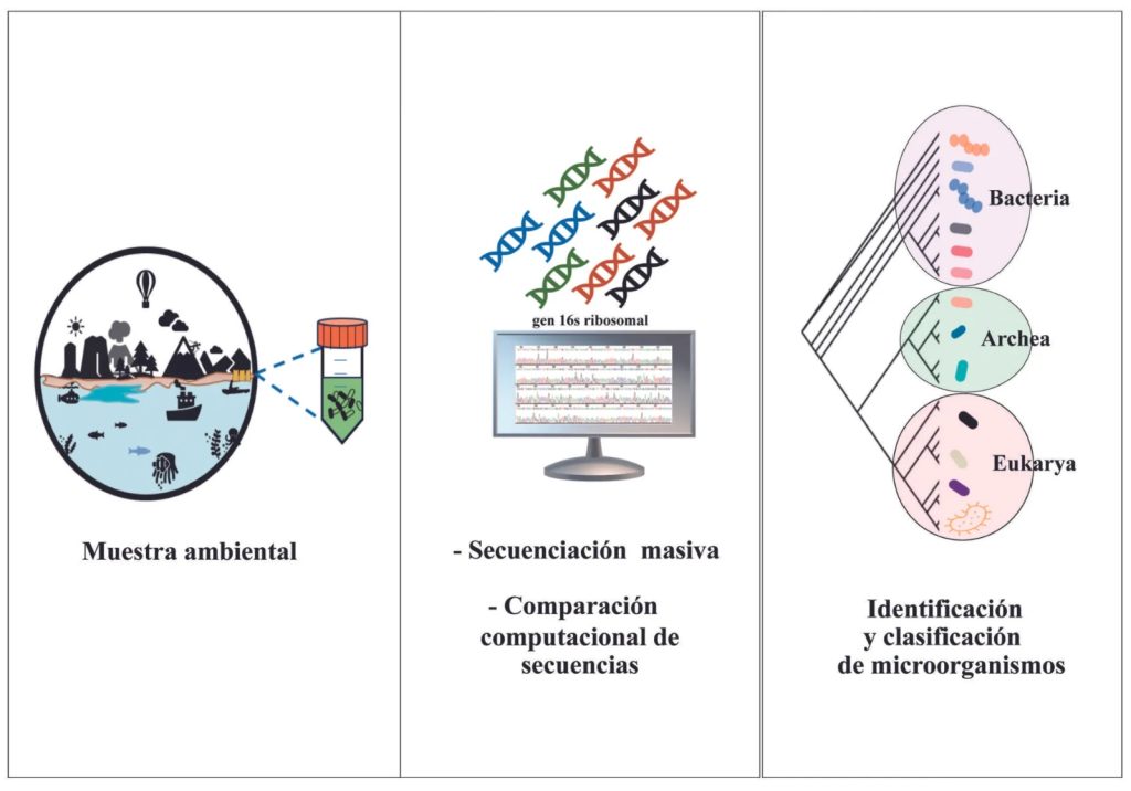 Actualmente, sin necesidad de cultivar en el laboratorio, podemos determinar qué microorganismos habitan en el ambiente gracias al desarrollo de la técnica conocida como reacción en cadena de la polimerasa (PCR por sus siglas en inglés). Esta innovación ha sido la base para la amplificación de segmentos de ADN como molde, posibilitando la obtención masiva del material genético de microorganismos presentes en muestras ambientales, tales como los océanos, la microbiota de distintos organismos, el suelo y el aire. Ahora, es factible conocer la diversidad microbiana de tales muestras sin recurrir al cultivo artificial en laboratorio. Las técnicas basadas en la secuenciación masiva permiten leer el ADN de muchos microorganismos a la vez y clasificarlos, lo que da a los científicos una imagen mucho más completa de la diversidad microbiana en un entorno (Figura 3).