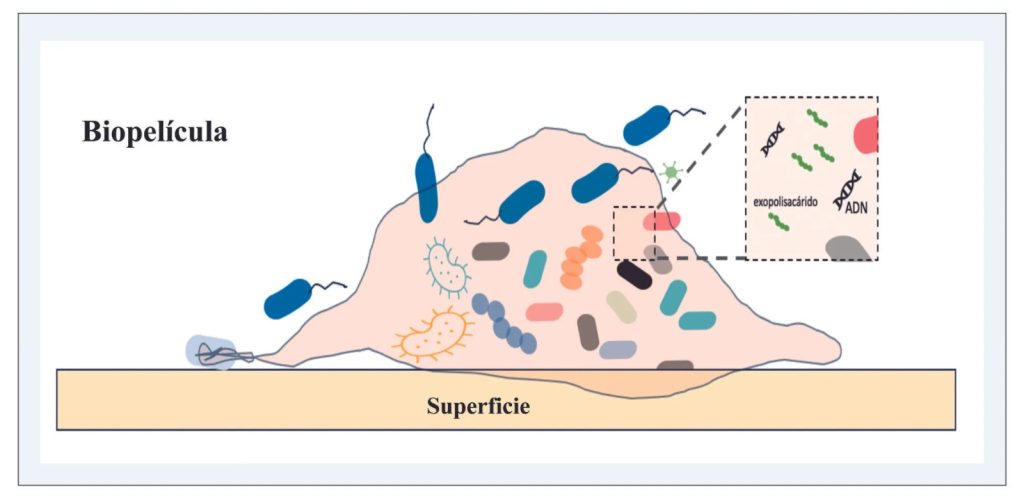 Por otro lado, las bacterias pueden crear superficies compuestas por azúcares conocidos como exopolisacáridos en donde las comunidades microbianas se adhieren y multiplican creando una estructura llamada biopelícula (Figura 2). Los microorganismos creciendo en las biopelículas se comunican a través de señales químicas que también regulan la estructura de la comunidad microbiana. La biopelícula es una herramienta que permite a los microorganismos colonizar superficies como el agua, suelo, y materiales quirúrgicos.