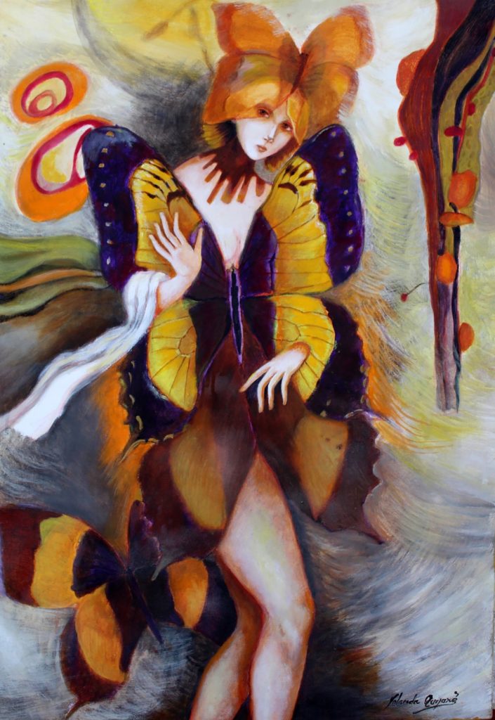 Al abordar temas fantásticos y místicos, considera que sus pinturas están influenciadas por el Realismo mágico, el Expresionismo abstracto y el Surrealismo.