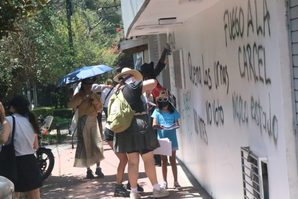 Durante su marcha, al pasar por las oficinas distritales del INE, ubicadas en la Avenida Manuel Ávila Camacho y Papantla, pintaron consignas y rompieron, con una silla, los cristales del acceso principal de los Módulos de Atención Ciudadana.