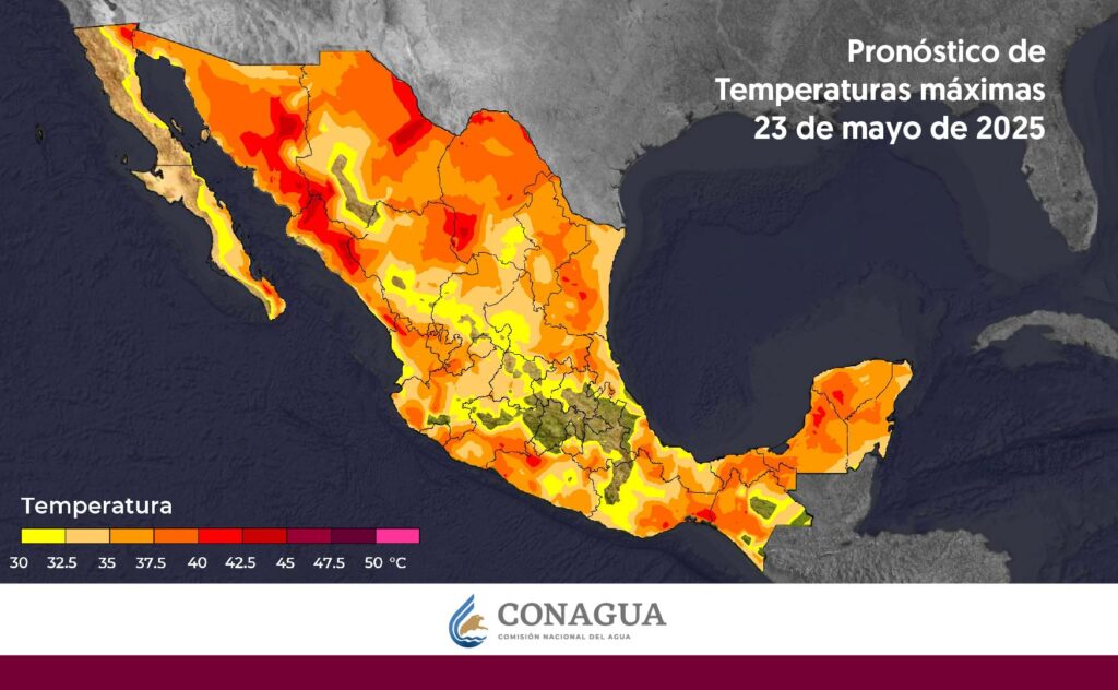 Las temperaturas máximas irán de 40 a 45 °C en Baja California, Sonora, Sinaloa, Chihuahua, Coahuila, Nuevo León, San Luis Potosí, Chiapas (norte), Veracruz (sur), Tabasco, Campeche y Yucatán.