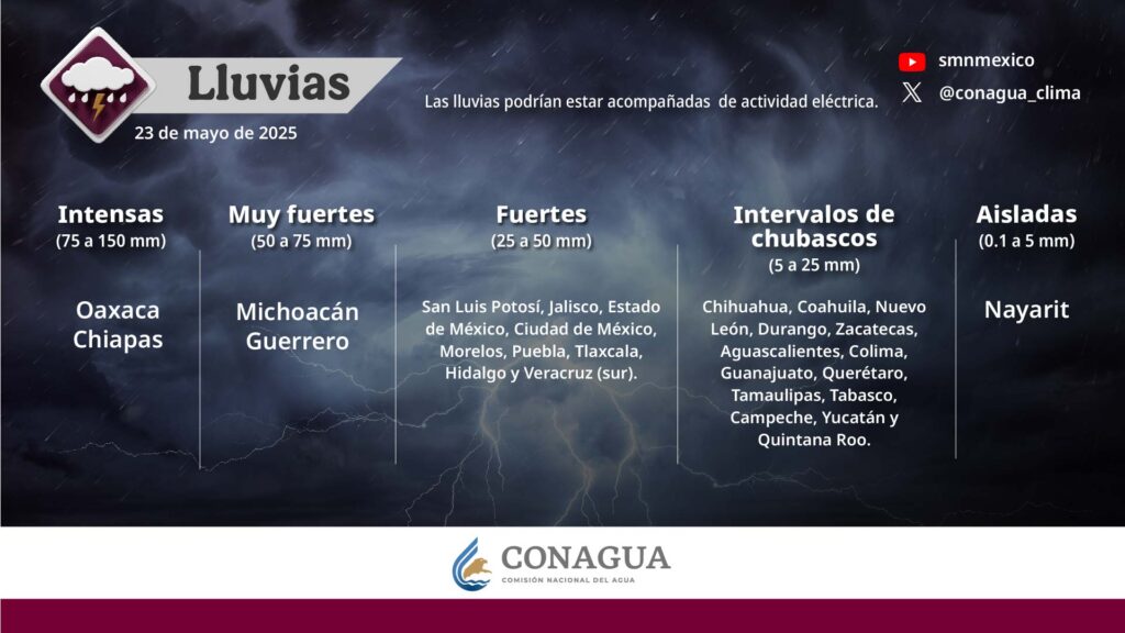Dichos sistemas ocasionarán chubascos con lluvias puntuales fuertes en el norte, noreste, centro, occidente, sur y sureste del país; con lluvias puntuales muy fuertes en Michoacán y Guerrero, y puntuales intensas en Oaxaca y Chiapas.