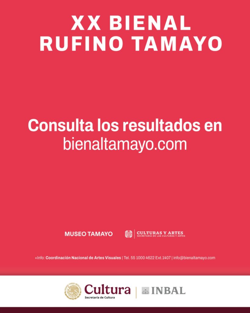 La Secretaría de Cultura del Gobierno de México y el Instituto Nacional de Bellas Artes y Literatura (INBAL), en colaboración con la Secretaría de las Culturas y Artes del Gobierno del Estado de Oaxaca, anuncian la selección de artistas como resultado de la convocatoria de la XX Bienal de Pintura Rufino Tamayo, que estuvo vigente del 25 de agosto de 2024 al 16 de mayo de 2025.