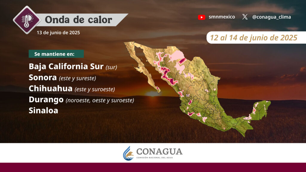 Señala que prevalecerá la onda de calor en Baja California Sur (sur), Sonora (este y sureste), Chihuahua (este y suroeste), Durango (noroeste, oeste y suroeste) y Sinaloa.