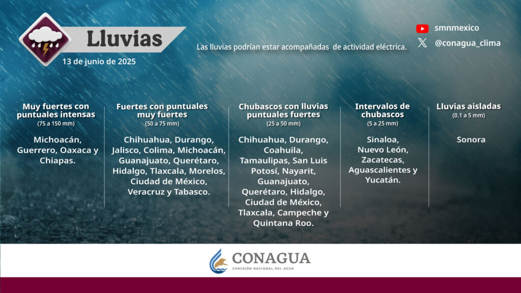 Las lluvias mencionadas, estarán acompañadas con descargas eléctricas, rachas de viento y posible caída de granizo.