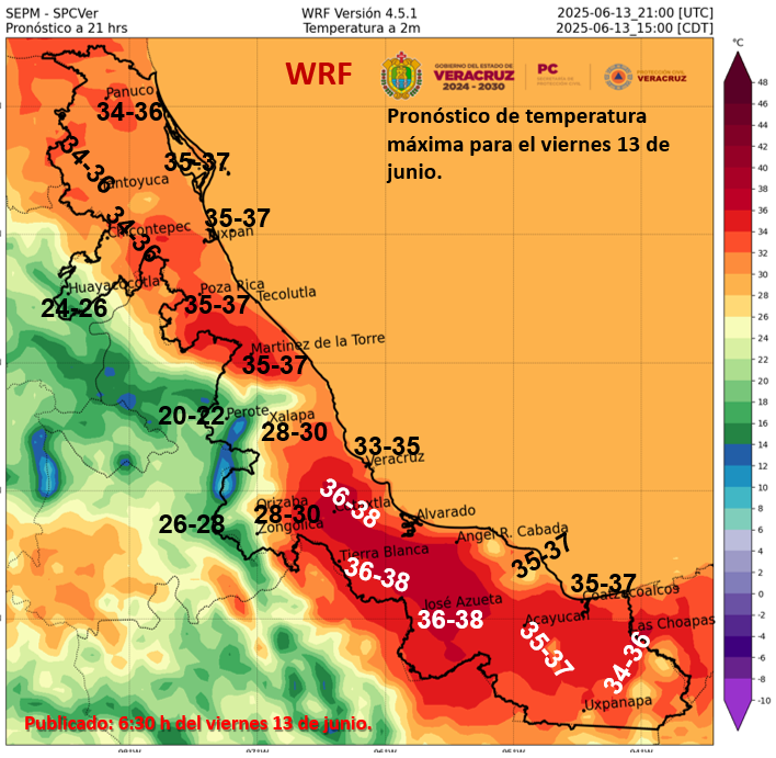 Por la mañana, cielo medio nublado, bancos de niebla en zonas altas de Tamaulipas y Veracruz; además de ambiente cálido en la región; fresco en zonas altas de Tamaulipas y con posibles lluvias en zonas de Veracruz. Durante la tarde, ambiente caluroso; cielo nublado con lluvias puntuales muy fuertes en Veracruz y Tabasco, así como puntuales fuertes en Tamaulipas, las cuales podrían incrementar los niveles de ríos y arroyos, generar deslaves, inundaciones, encharcamientos y visibilidad reducida. Viento del sureste de 30 a 40 km/h con rachas de 50 a 70 km/h en Tamaulipas y de 40 a 60 km/h en costas de Veracruz; además de 10 a 20 km/h con rachas de 40 km/h en Tabasco.