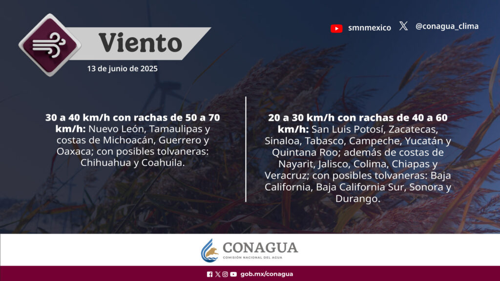 Viento de 20 a 30 km/h con rachas de 40 a 60 km/h en San Luis Potosí, Zacatecas, Sinaloa, Tabasco, Campeche, Yucatán y Quintana Roo.