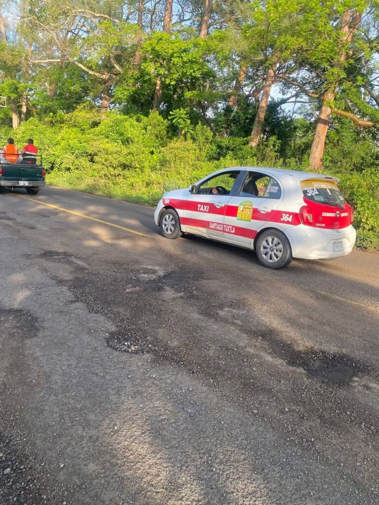 SantiagoTuxtla, Ver. – Otro accidente vehicular por el mal estado del encarpetado asfáltico, se suscitó recientemente en el tramo federal San Andrés – Santiago Tuxtla de la carretera 180. Apenas este jueves 26 de junio de 2025, se registró una carambola entre autos del servicio público en su modalidad de taxi y un transporte de pasajeros también del servicio público urbano, esto a la altura del hotel Los Pinos, en Santiago Tuxtla, este tramo sólo es transitable en un solo carril.