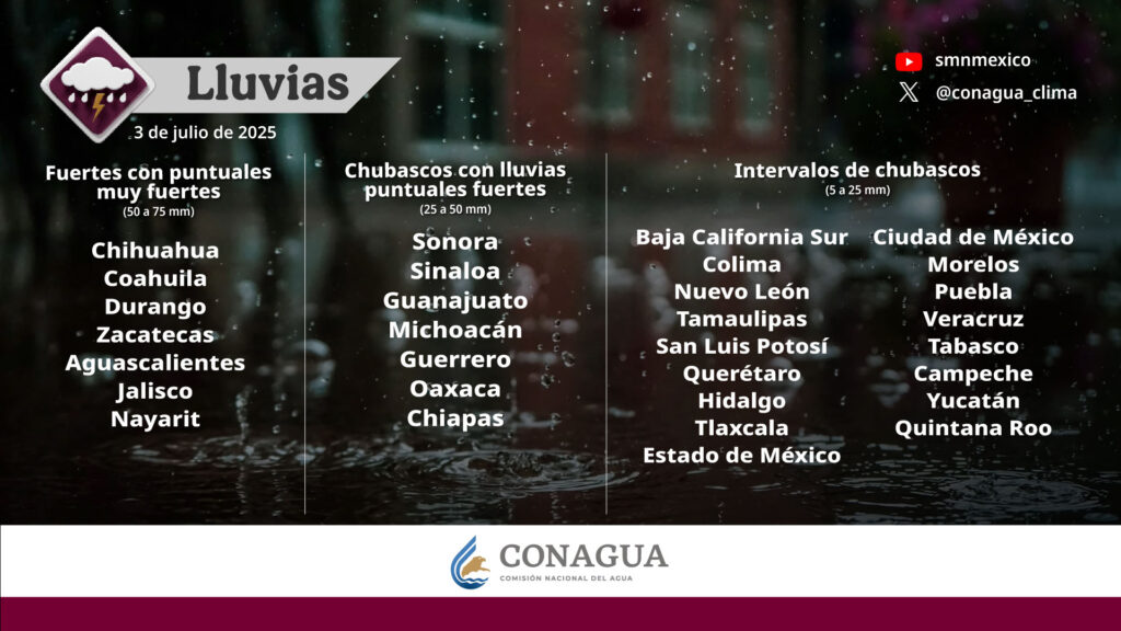 Intervalos de chubascos (de 5 a 25 mm) en B. California Sur, Colima, Nvo. León, Tamaulipas, S.L. Potosí, Querétaro, Hidalgo, Tlaxcala, EdoMéx, CdMx, Morelos, Puebla, Veracruz, Tabasco, Campeche, Yucatán y Quintana Roo.