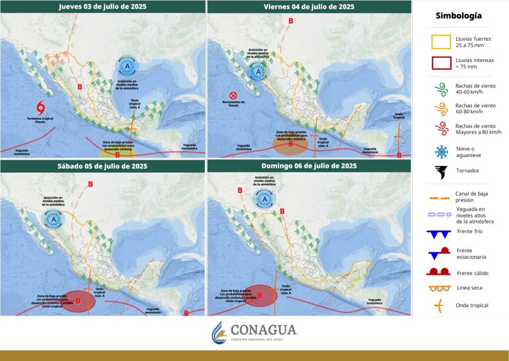 Este día, Informa la CONAGUA, la tormenta tropical “Flossie” continuará debilitándose al suroeste de la península de Baja California.