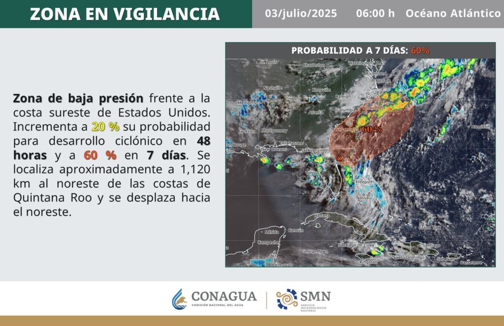 Anuncia un canal de baja presión sobre la Mesa del Norte, la Mesa Central y el oriente del país, en combinación con inestabilidad atmosférica y el ingreso de humedad del océano Pacífico y golfo de México.