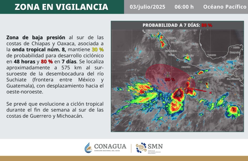 Por otra parte, la onda tropical número 8 se desplazará frente a las costas de Chiapas y Oaxaca en asociación con una zona de baja presión con probabilidad para desarrollo ciclónico.