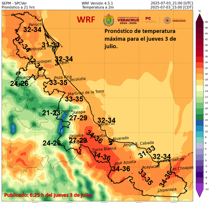 Abunda que se mantendrá el ambiente caluroso a muy caluroso en entidades del noroeste y norte de la República Mexicana, además de la península de Yucatán; con temperaturas de 40 a 45 °C en Baja California, Sonora y Sinaloa.